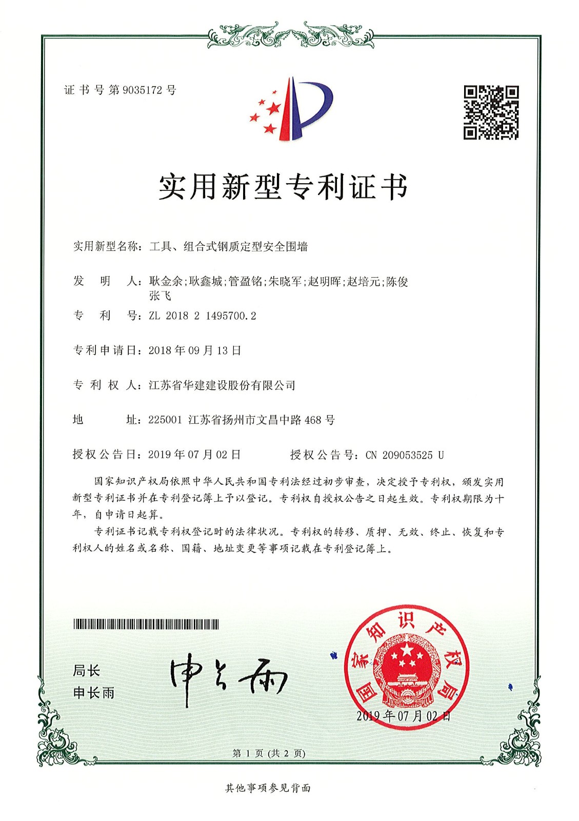 實用新型專利證書(工具、組合式鋼質定型安全圍墻)